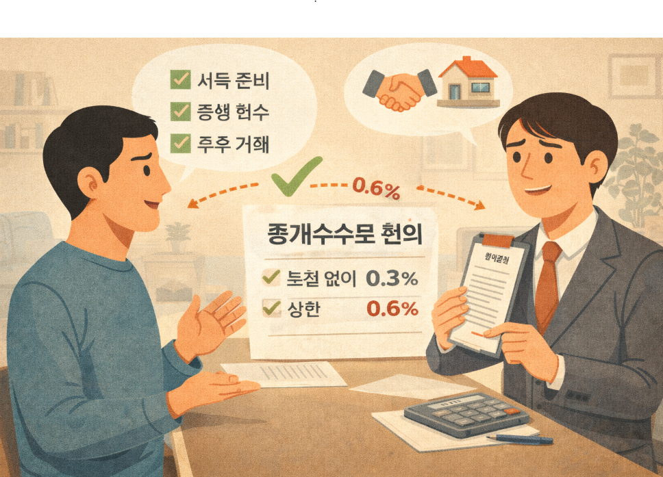 부동산 중개수수료는 ‘무조건 깎는 영역’이 아니라 거래 조건을 정교하게 정리해 합법적으로 협의할 수 있는 영역이며, 협의 문장을 준비하면 분쟁 가능성도 함께 줄어든다.